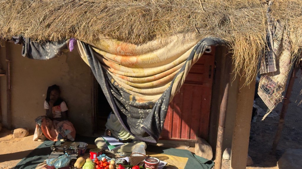 La gente, sopratutto donne, vestite con abiti leggeri e colorati, hanno il capo coperto con sciarpe dello stesso colore dell’abito. Alcune sono scalze, altre accucciate per terra a badare alla loro mercanzia.