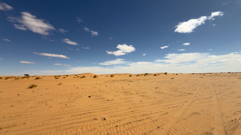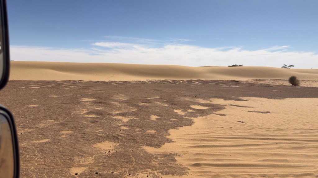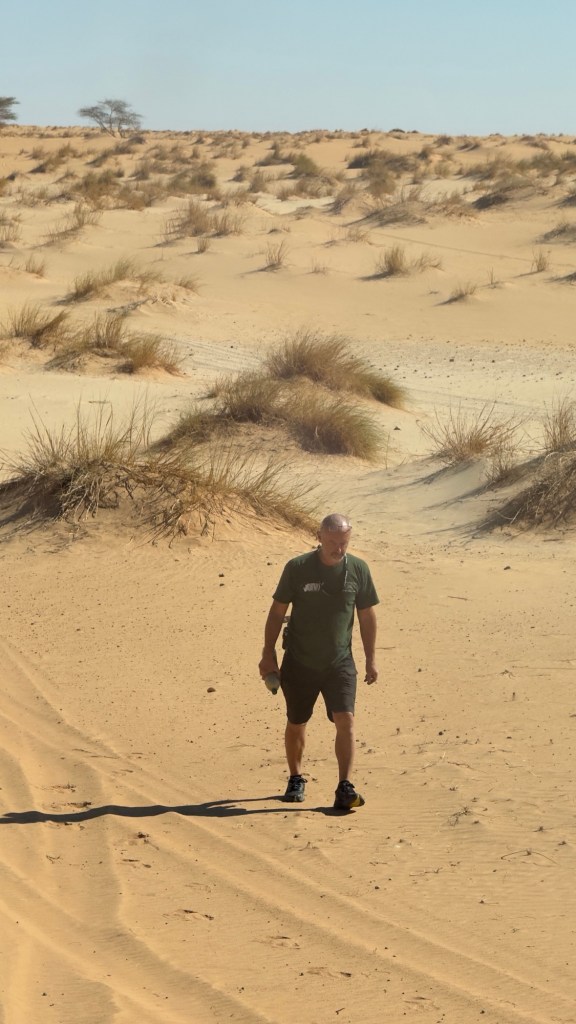 Alcuni arbusti e alberi spinosi, disseminati in mezzo alle dune, ci fanno intendere che, nel sottosuolo, un po’ di acqua deve esserci.