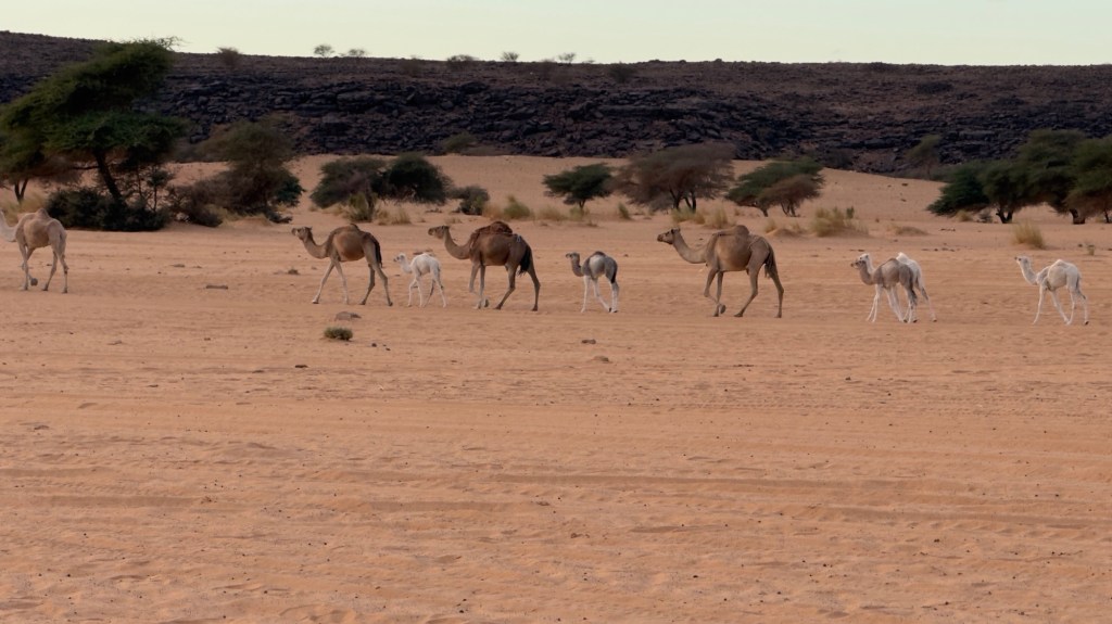 Lungo la pista, decine di cammelli avanzano lenti; sembrano riuniti in famiglie.