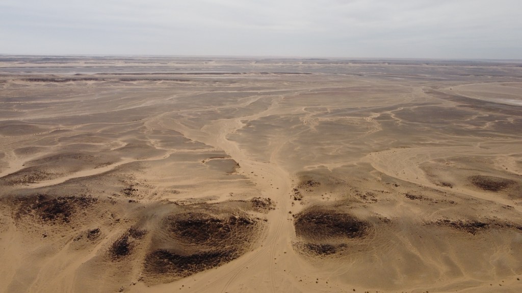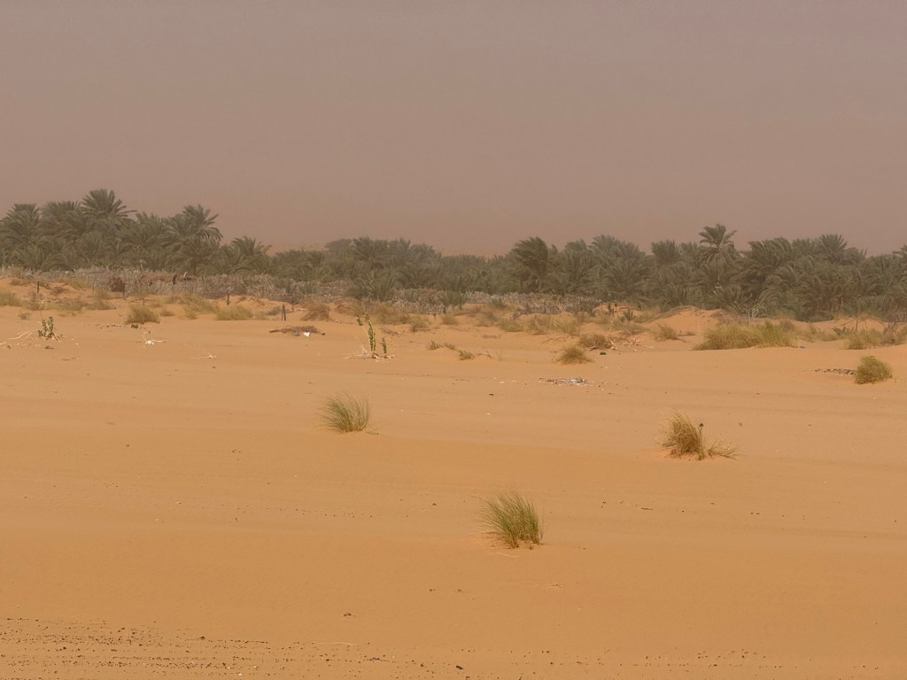 Il cielo è bianco e l’orizzonte confuso dalla polvere.