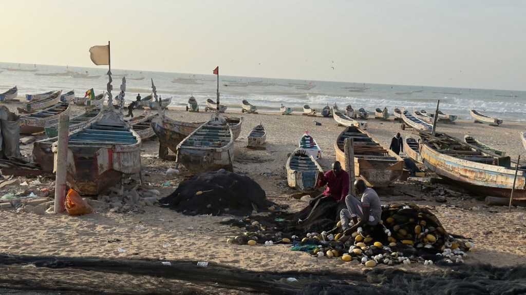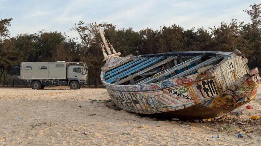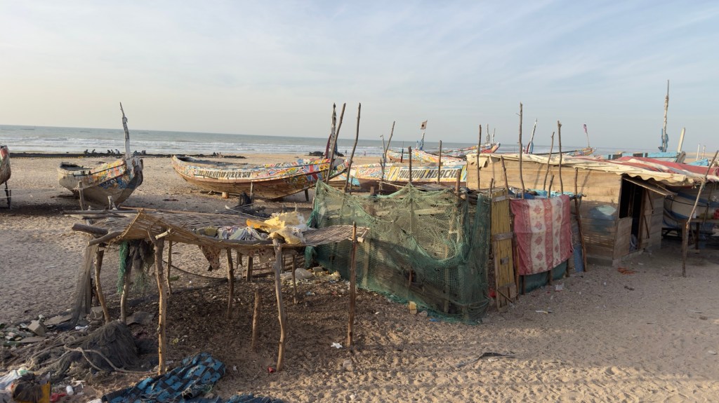 Riattraversato il villaggio, ritorniamo in senso contrario per un paio di chilometri; ci fermiamo lungo la spiaggia, alle spalle di una pineta, vicino ad una grossa imbarcazione di quelle tipiche del Senegal. Non c’è nessuno.