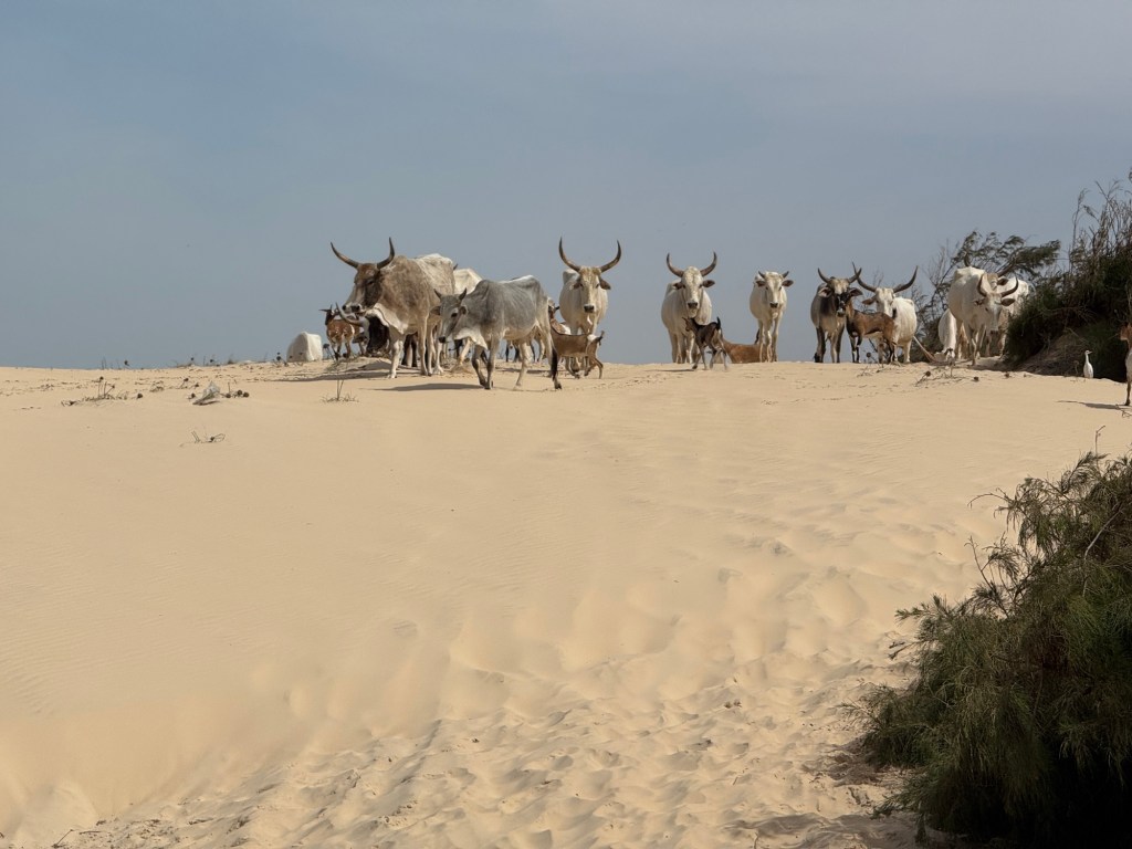 Incontriamo un gregge di vacche dalle lunghe corna insieme a qualche minuscola carpetta che si apprestano ad invadere il territorio.