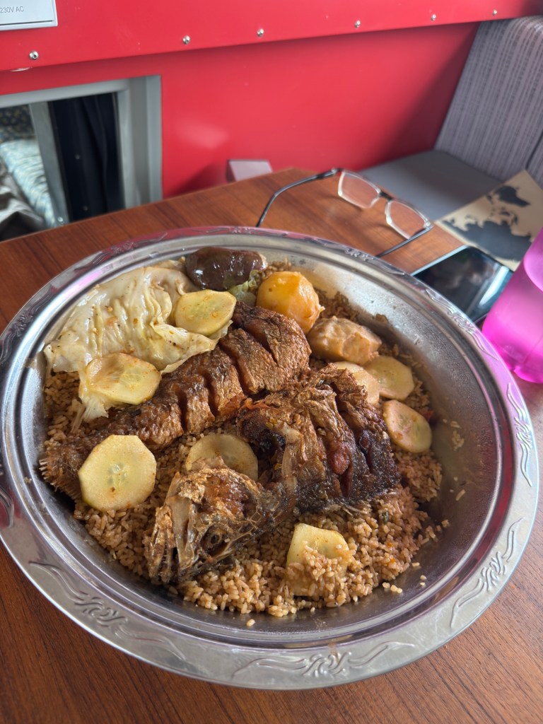 Alle 14, Jabal ci porta un vassoio con un pesce e del riso, che consumiamo nel Truck.