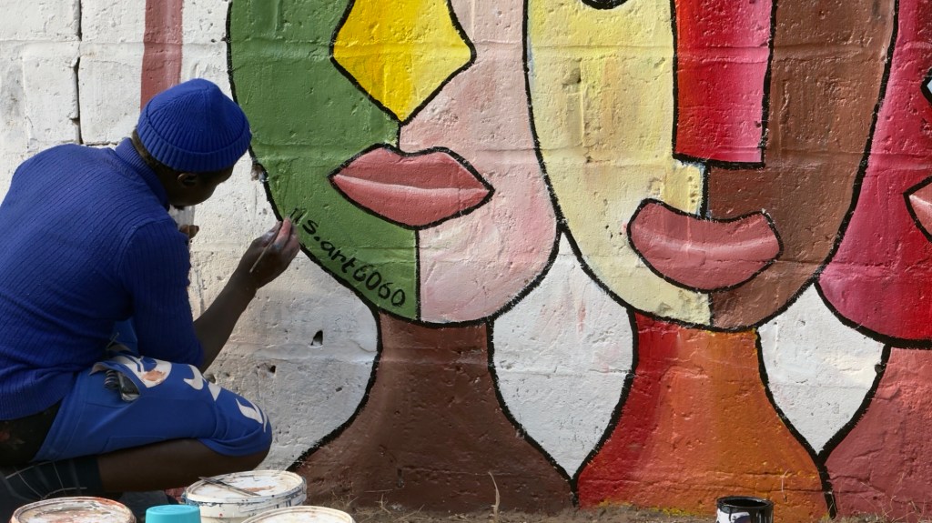 Per prima cosa, ci mostra alcuni dei murales e poi ci accompagna al recinto dove si sta svolgendo la manifestazione.