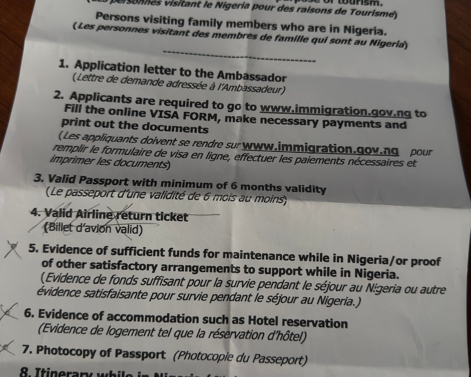 Una signora gentile, in inglese, visto che la Nigeria è un paese anglofono, ci ha spiegato tutto quanto era necessario portare. Passaporto, fotocopia dello stesso, prenotazione alberghiera, tragitto da effettuare in Nigeria, visto della Guinea, modulo compilato on line e ricevuta del pagamento.