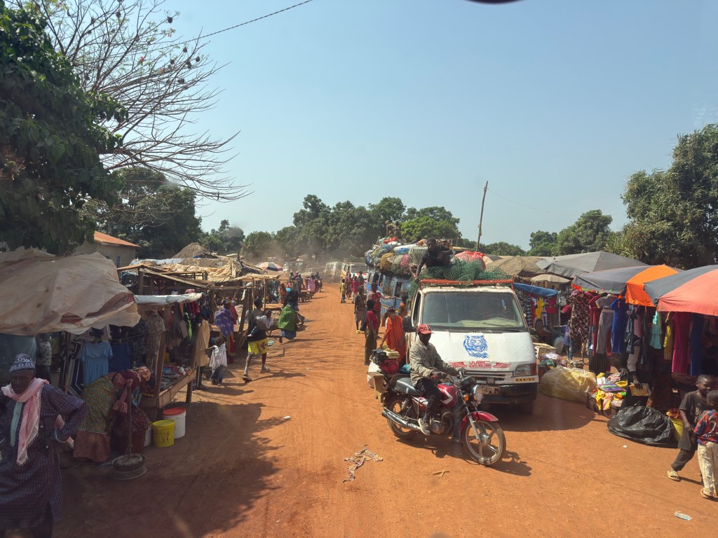 Partiti questa mattina, abbiamo fatto il primo tratto di viaggio, fino alla cittadina di Faranah, sullo stesso sterrato di terra rossa che avevamo intrapreso ieri pomeriggio.