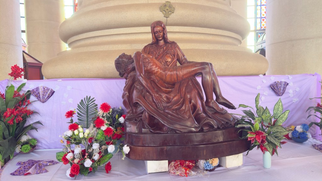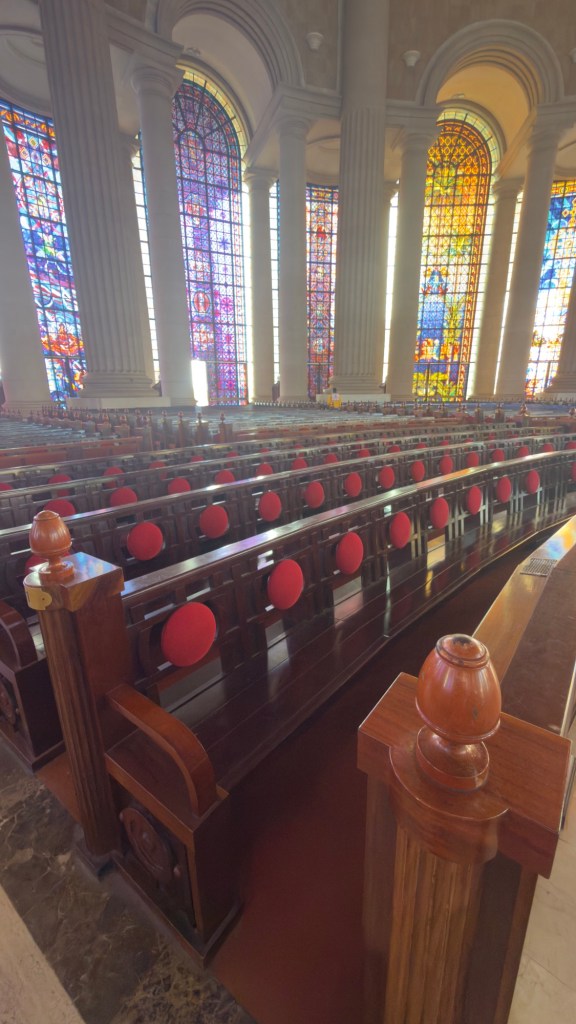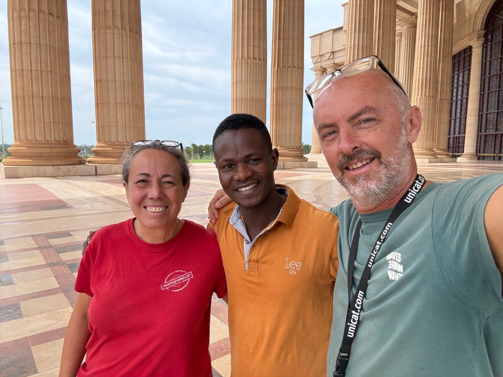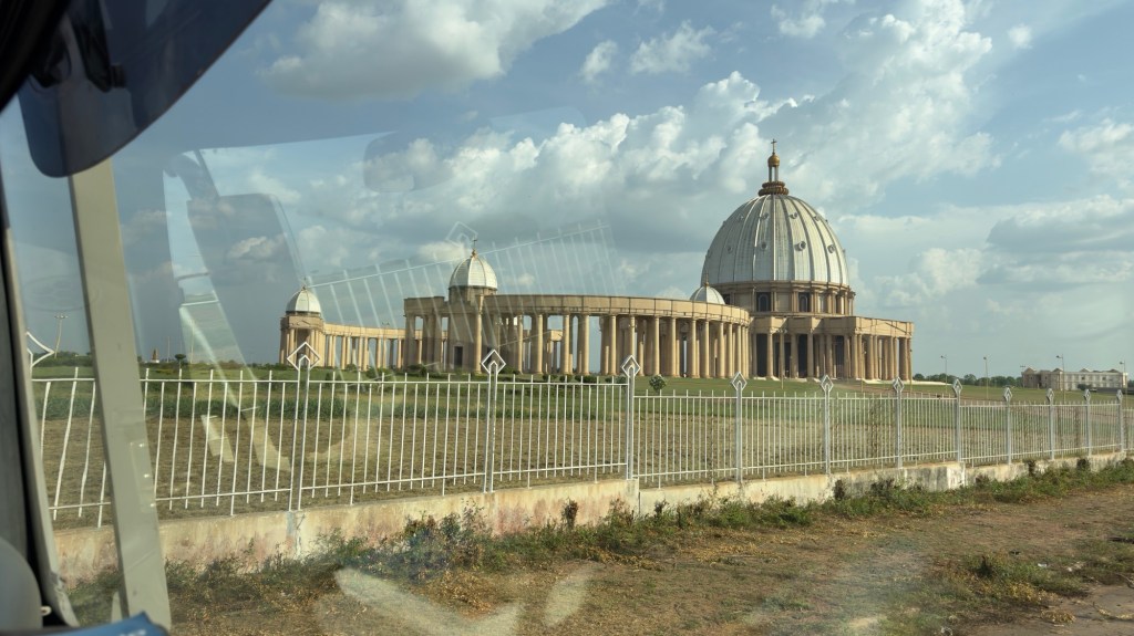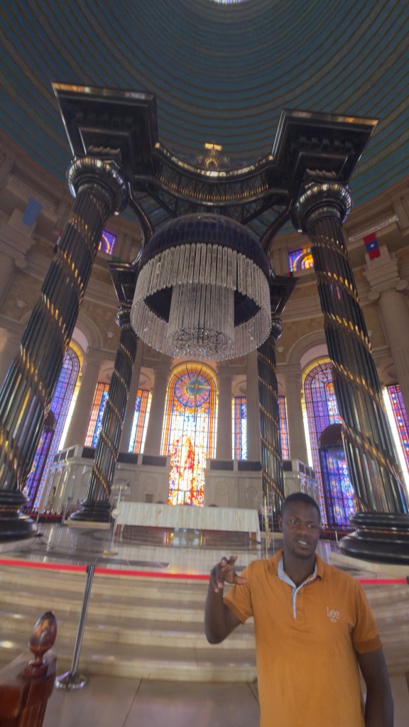 Questa mattina, dopo aver dormito nella boscaglia, vicino alla basilica, abbiamo parcheggiato il Truck di fronte all’ingresso e siamo entrati per la visita guidata della Basilica. Un giovane che parlava un ottimo inglese, ci ha condotto all’interno della chiesta e ci ha fornito tutte le informazioni in merito alla costruzione e al significato delle immagini delle magnifiche finestre. I marmi arrivano da Italia, Spagna e Portogallo mentre il legno delle panche è ivoriano ma lavorato in Italia. In tutta la chiesa c’è l’aria condizionata che fuoriesce da bocchette poste nelle panche e dal pavimento. Un magnifico lampadario in cristallo è posto sopra l’altare di marmo, adornato da una croce appesa con un filo invisibile a più di due metri di altezza, tanto che sembra volare. Molti sono i riferimenti a San Pietro come la statua della pietà di Michelangelo, riprodotta fedelmente in un unico pezzo di legno ma ci sono anche statue particolari fatte da artisti ivoriani.
