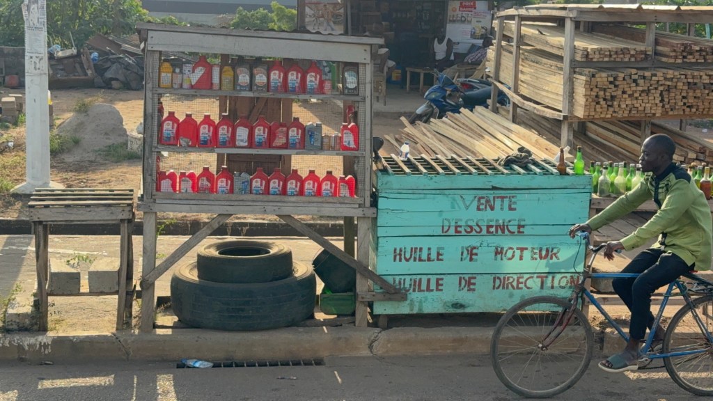 E’ stancante evitare le buche, occorre zigzagare fra una corsia e quella opposta. Per fortuna non c’è molto traffico. Solo qualche piccola corriera e i soliti motorini. I villaggi che incrociamo non rappresentano la parte moderna della Costa d’Avorio. Ritornano le bancarelle, i vestiti tradizionali delle fanciulle e molta, moltissima sporcizia.