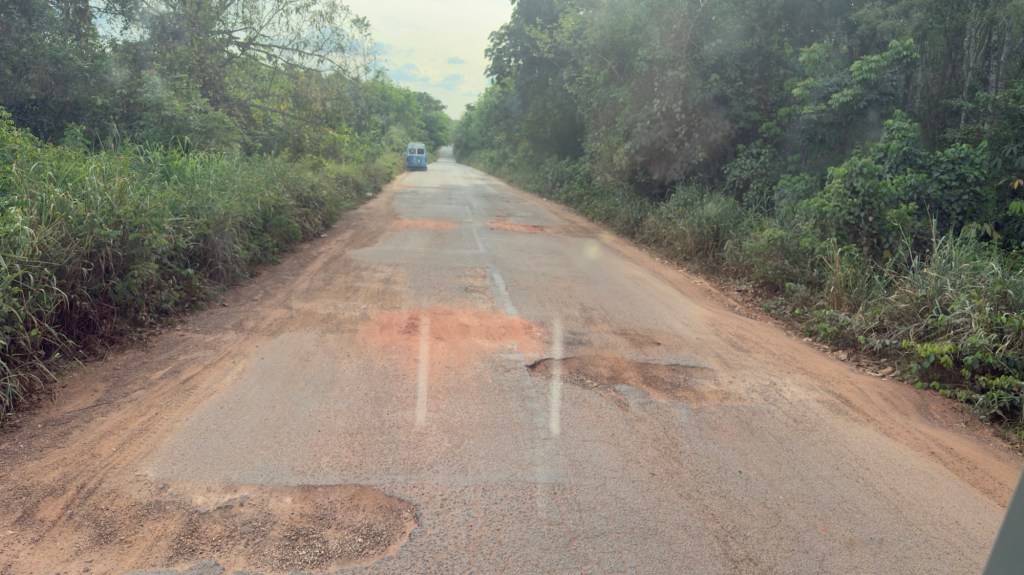 Il manto stradale è pieno di buche. I molti camion che percorrono questa rotta, rovinano il cemento.