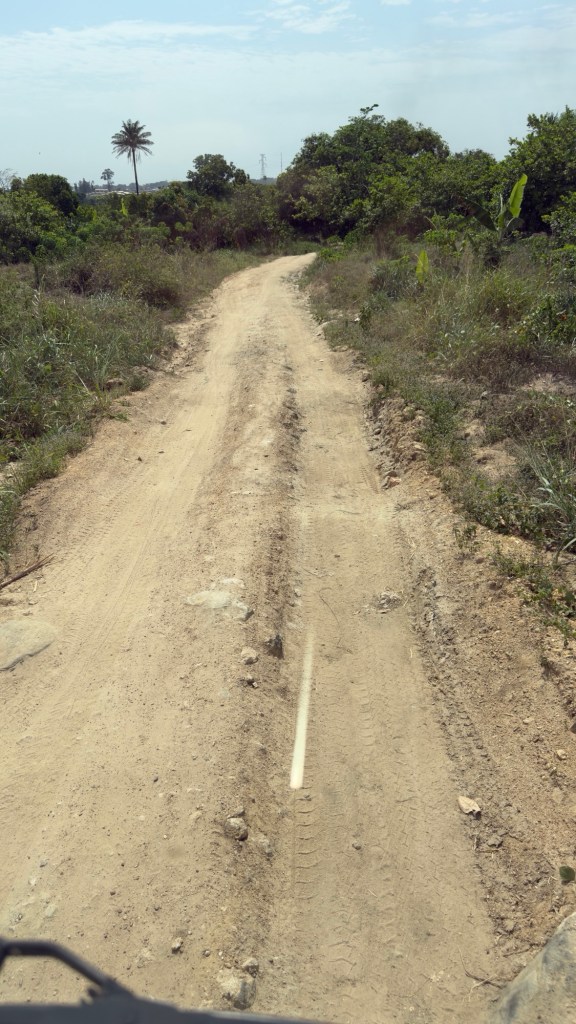 Superato il villaggio imbocchiamo una strada di terra rossa dissestata ma abbastanza ampia e seguiamo la costa , in mezzo alla fitta vegetazione.