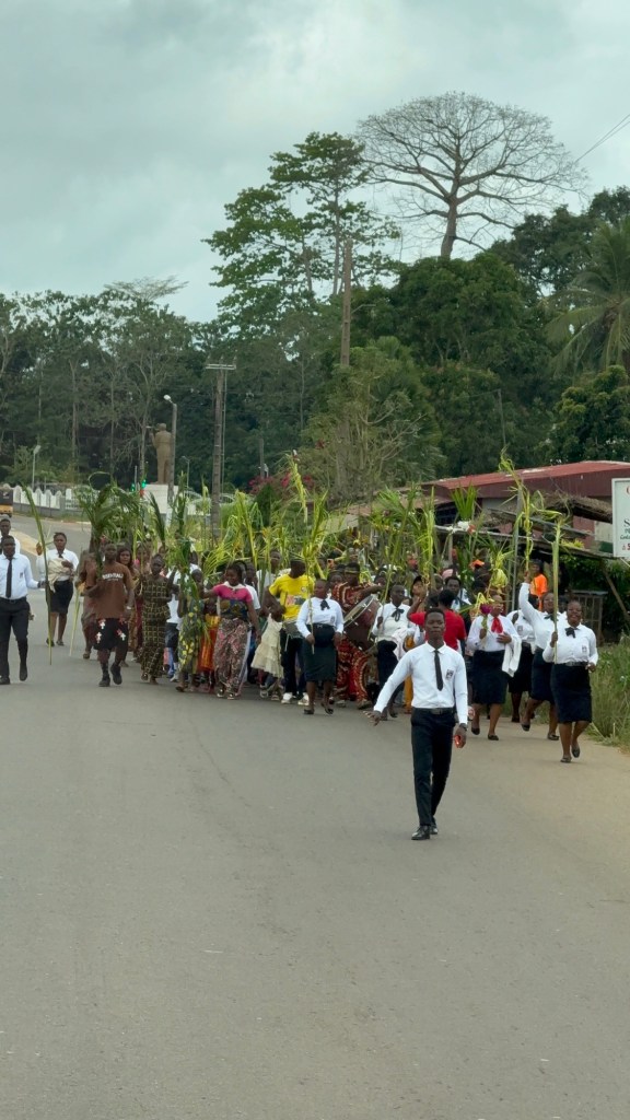 Diverse persone, con i loro vestiti più eleganti, camminavano lungo la strada principale, cantando e sventolando foglie di palma.