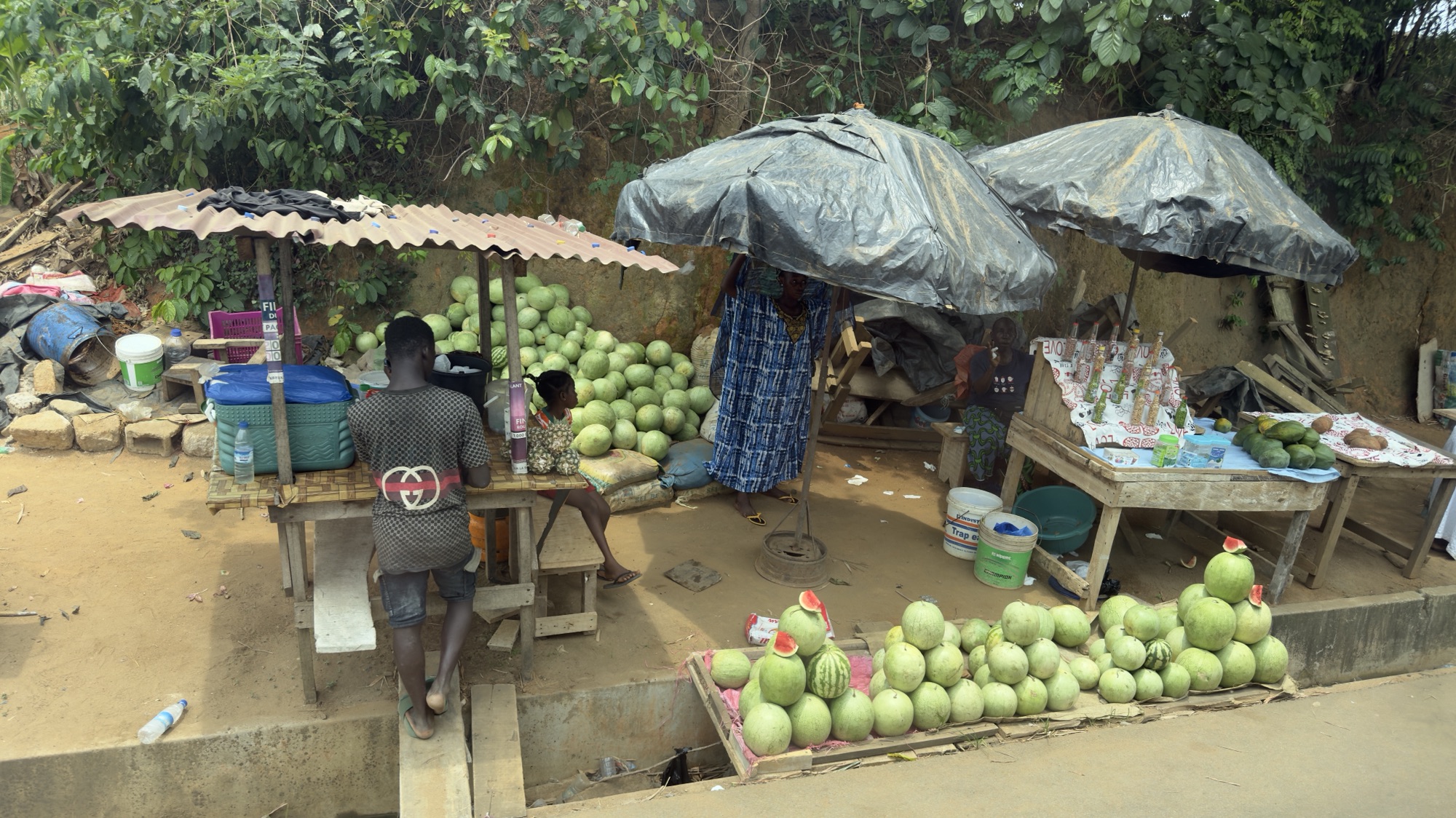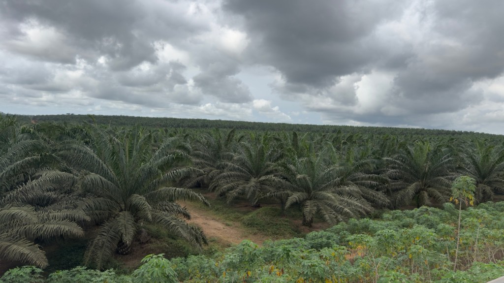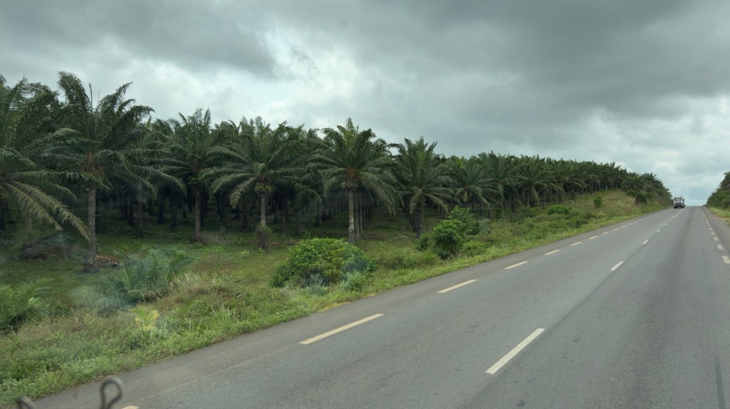 Su entrambi i lati della carreggiata, ci sono enormi piantagioni di alberi da palma, quelli per l’olio di palma. Nei pressi di Abidjan invece, saranno sostituiti da piantagioni di banane.