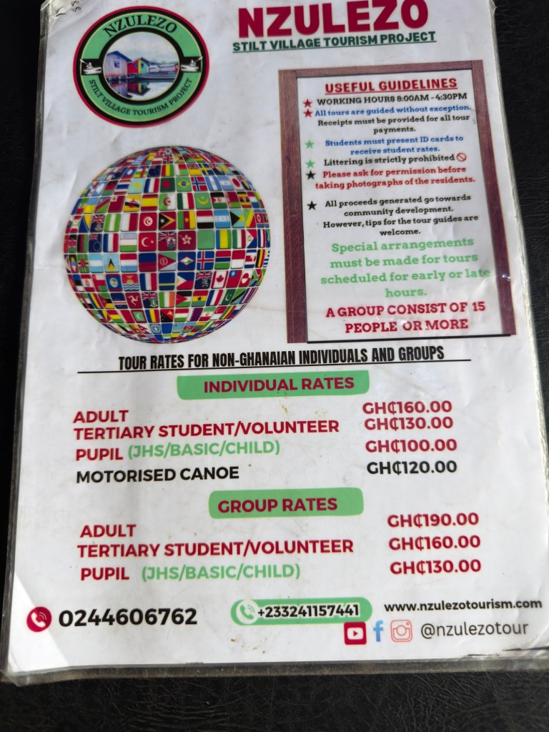 Note: prezzo del tour a Nzulezu (vedi foto)- prezzo visita forte di Princess town 40 cedi a persona.