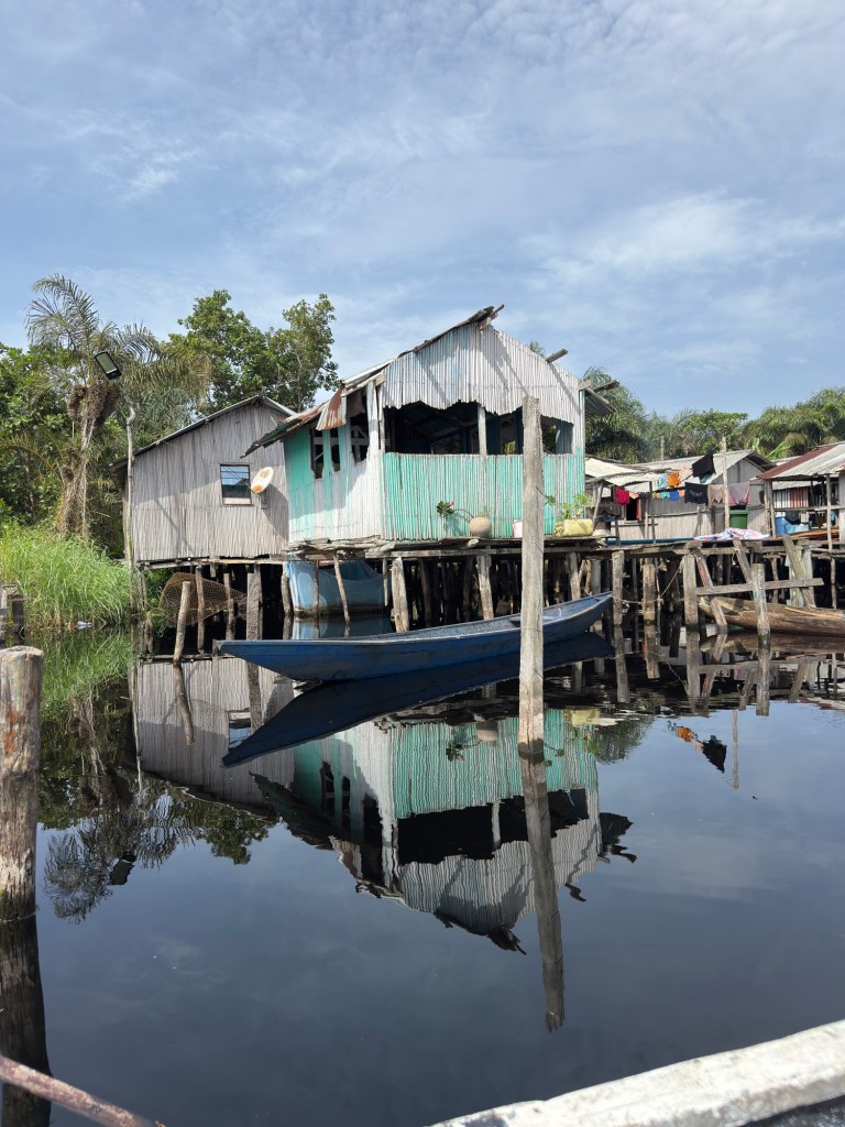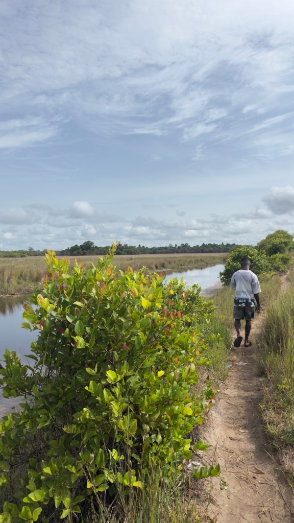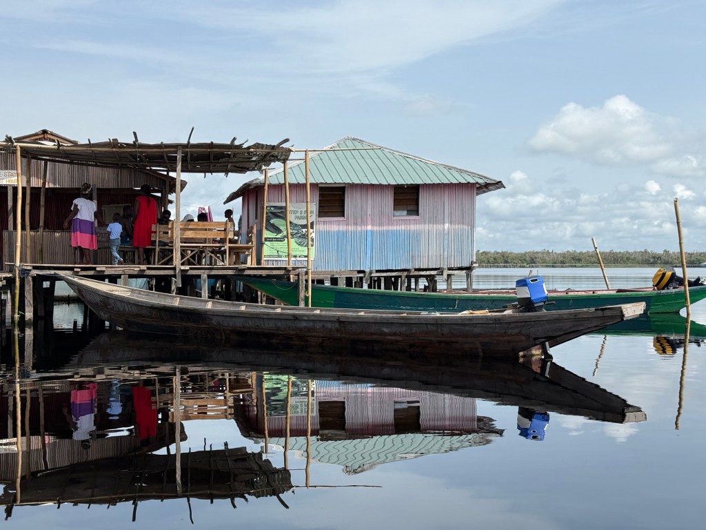 Con un ragazzo di nome Dominique, nativo di Nzulezu, che ci ha fatto da guida, abbiamo camminato per circa 20 minuti, sotto il sole, lungo il torrente secondario, fino a raggiungere il molo da dove partono le imbarcazioni nella stagione secca.