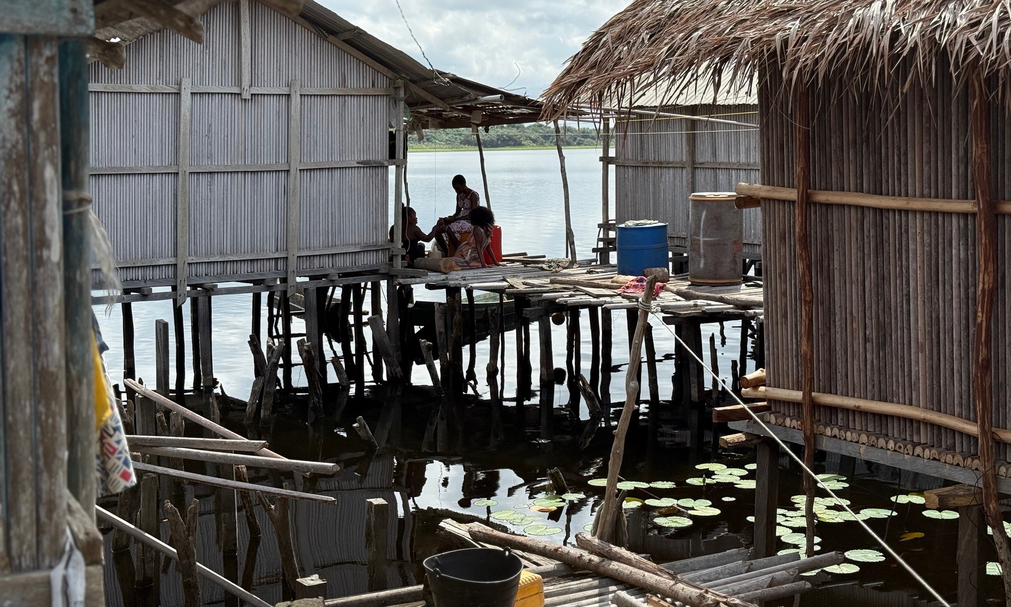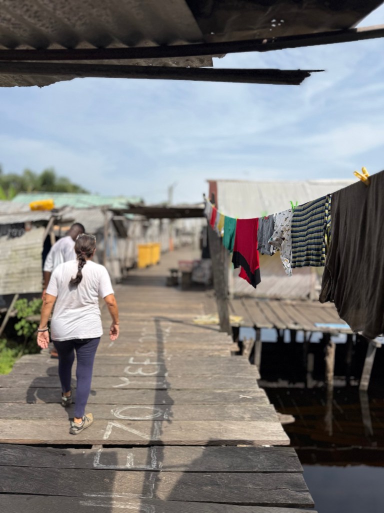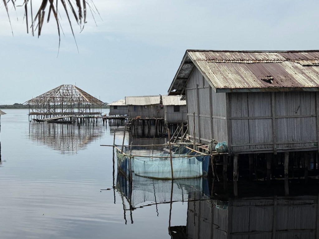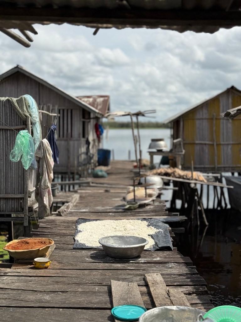 Una volta giunti al villaggio dì Nzulezu, abbiamo percorso tutto l’abitato camminando su piattaforme galleggianti che si ergono sull’acqua grazie ad un sistema di palificazioni, piantate nel fondo della laguna.
