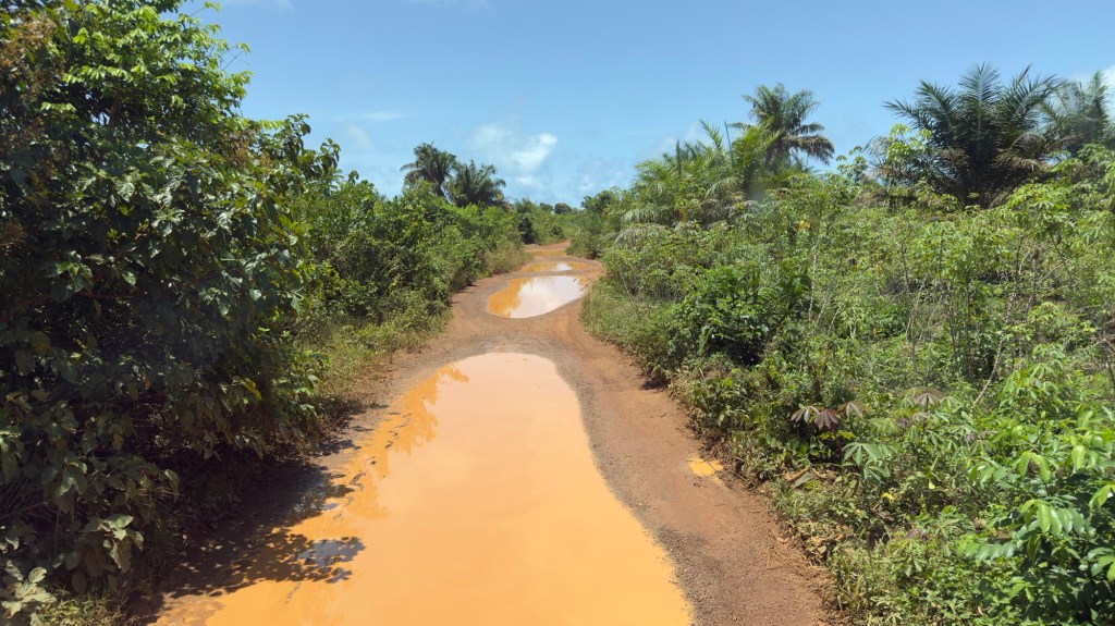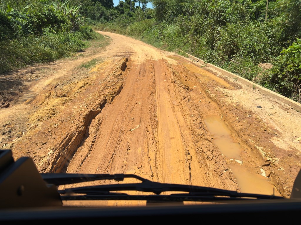 Imbocchiamo un’altra strada sterrata, in brutte condizioni, in mezzo alla foresta. Non sembravano molti chilometri male condizioni del terreno la rendono poco praticabile.