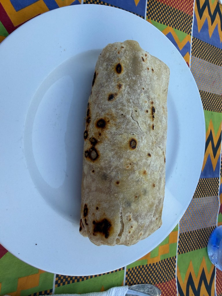 Ci godiamo un ottimo pasto a base di tortilla di mais ripiena con riso, pollo, fagioli e verdure per me è del pollo impanato e patatine per davide, bagnati da birra grande ed acqua (cide 200).