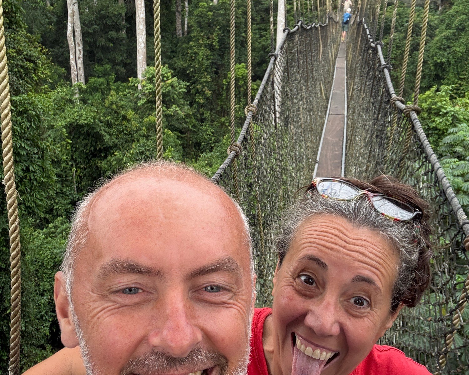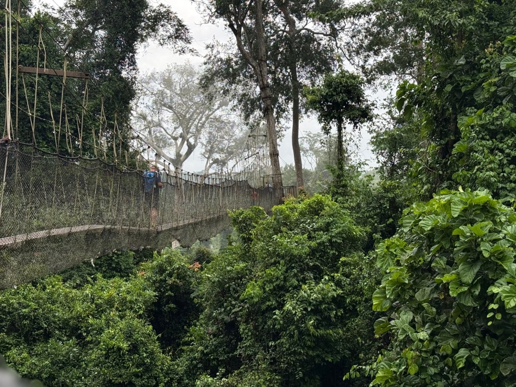 Un piede dopo l’altro, reggendoci alla rete, camminiamo sui legni larghi una trentina di centimetri, osservando la folta vegetazione che avvolge tutto sotto di noi. Il Canto di uccelli è la colonna sonora di questa esperienza non pericolosa ma emozionante. Dopo ogni ponte c’è una base fissata agli alberi dove è possibile fermarsi per riprendere fiato. Le passerelle oscillano e sussultano leggermente mentre camminiamo ma, essendo protetti da una rete alla quale è possibile aggrapparsi, non si corre nessun rischio.