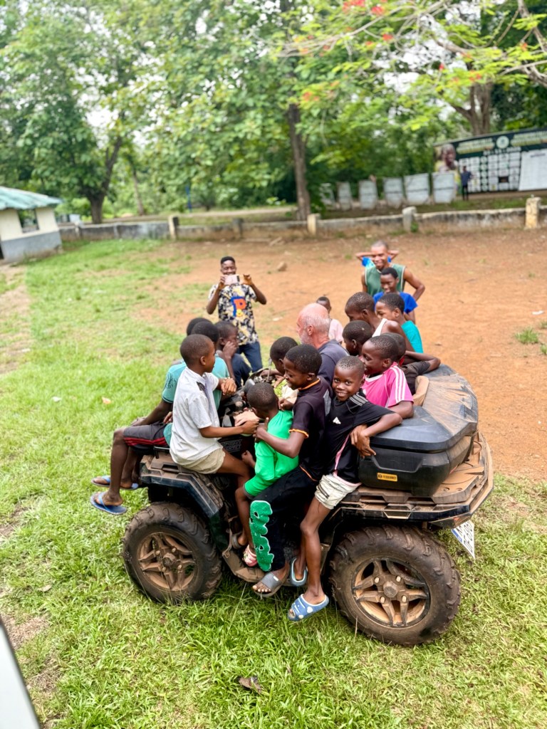 Ed eccoli tutti in moto per il villaggio, fino alla scuola, a farsi vedere insieme all’uomo bianco sul suo veicolo a motore!
