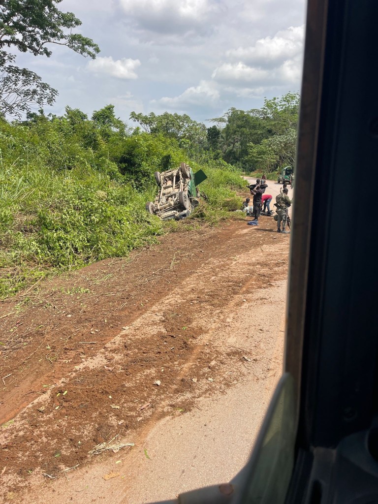 Per la troppa velocità, l’auto del convoglio, prende una delle molteplici buche del terreno e esce di strada, cappottandosi.