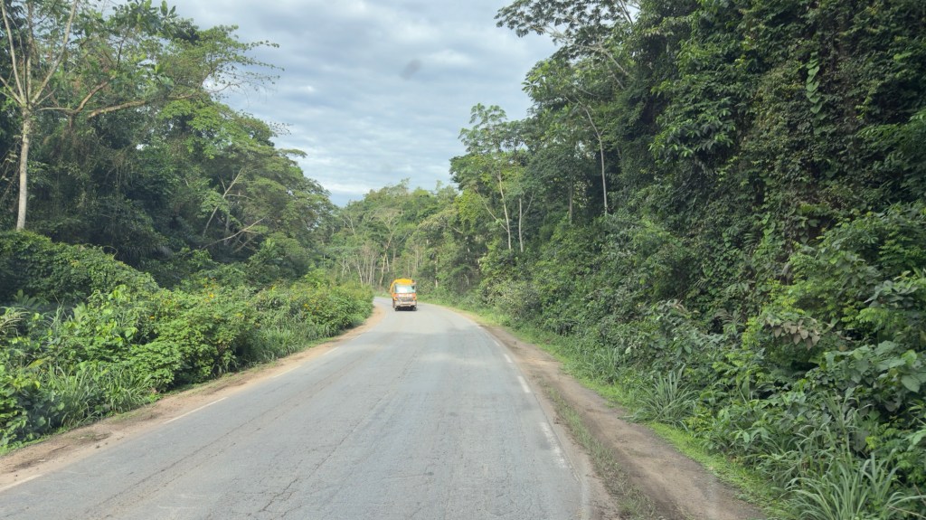 La strada si snoda in mezzo ad una foresta fittissima. Banani, palme, piante rampicanti, la vegetazione è molto variegata.