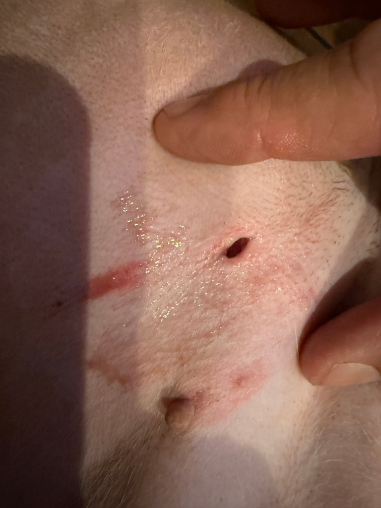 La ferita che equivale ad un canino penetrato in profondità, perde liquido trasparente, leggermente rosato.