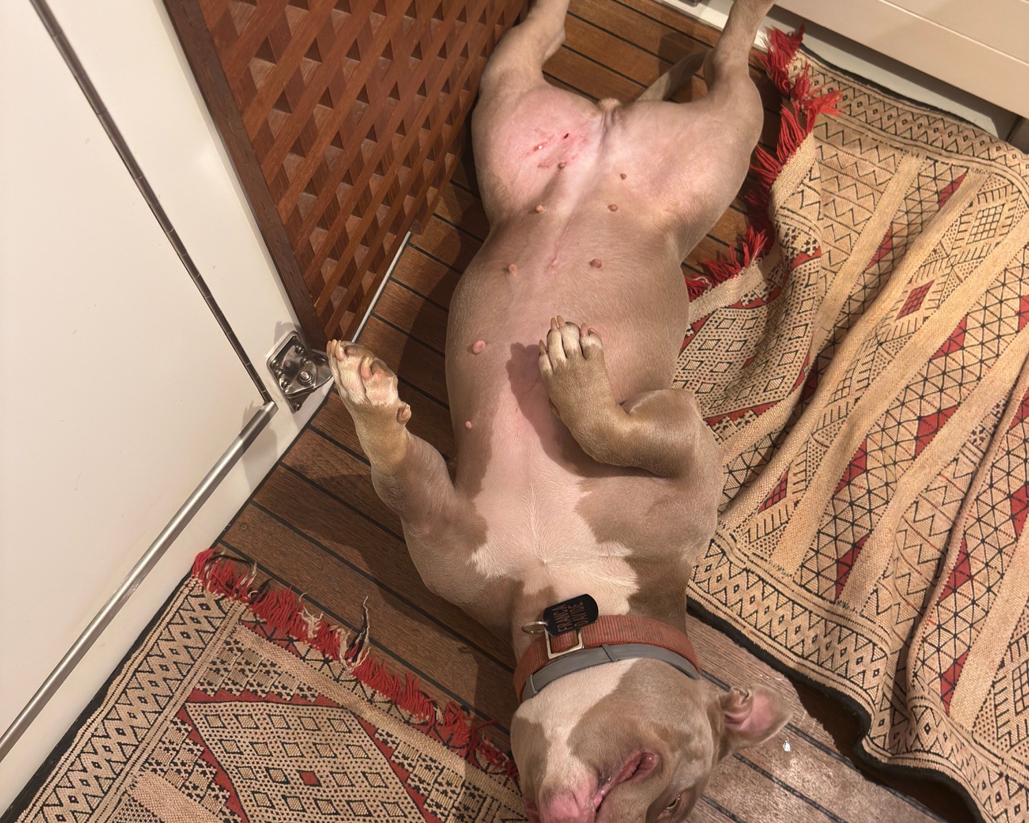Usciamo con i nostri pelosi ma, al ritorno dalla breve camminata, sentiamo abbaiare e , non ho fatto in tempo ad aprire la porta del Truck che, il pastore tedesco adulto, si è avventato sulla mia povera Yoda.